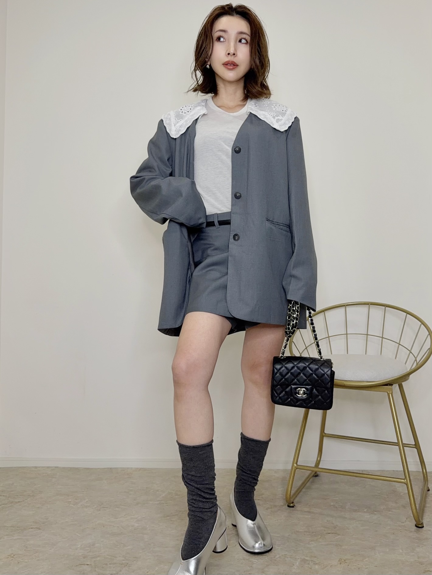 大人可愛いフリルの襟がポイントのジャケットセットアップ♡