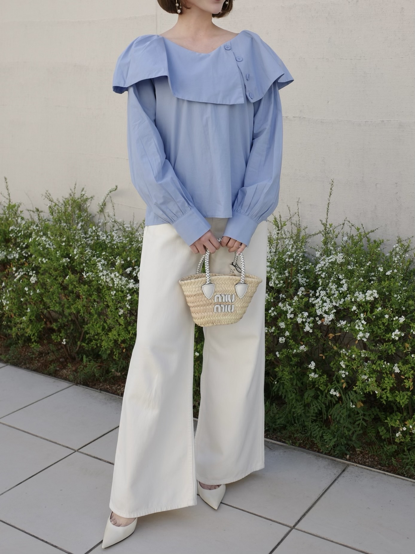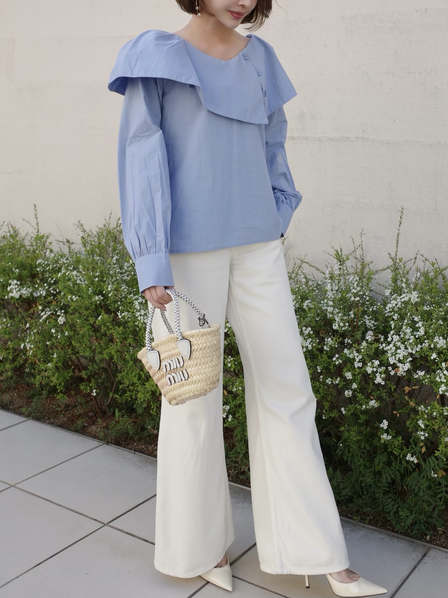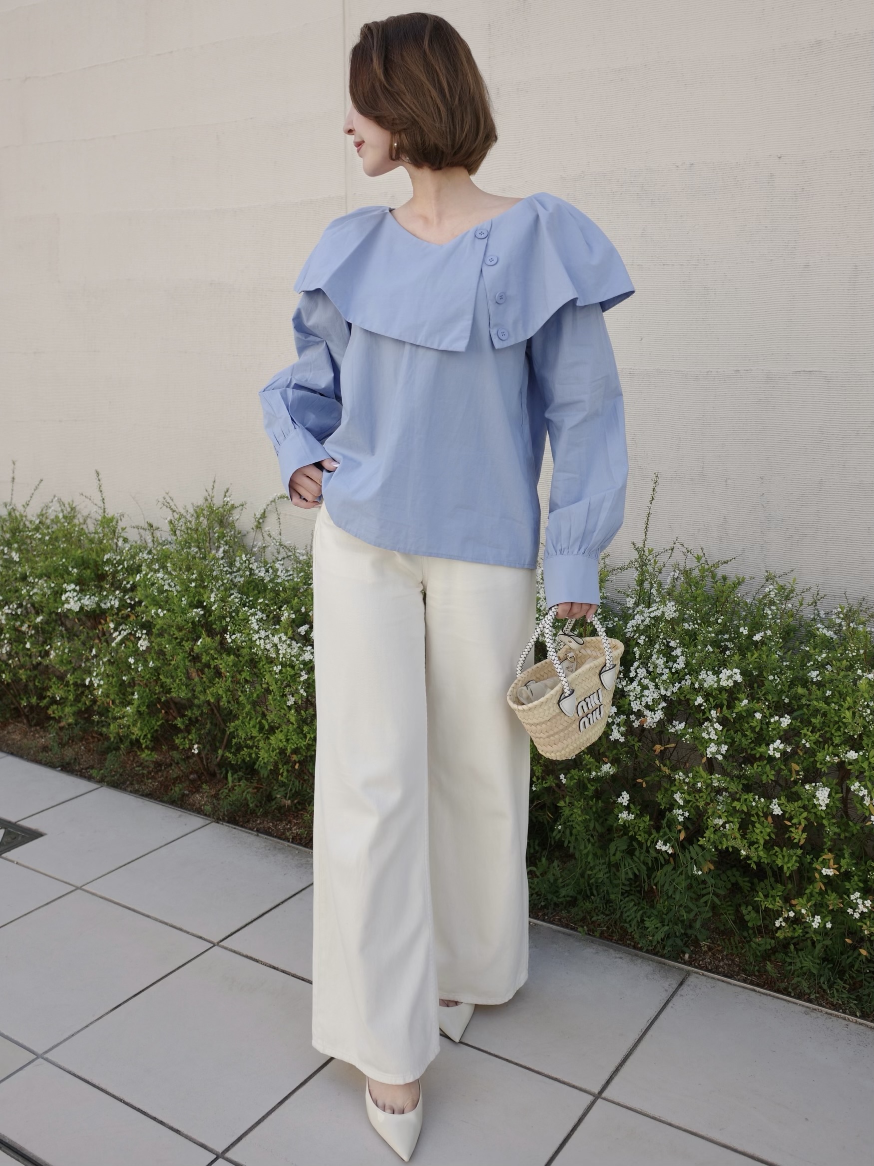 シンプルながらも1枚で着映えするブラウス。動く度軽やかに揺れる襟がポイント。スラックスやデニムなどボトムスを選ばないデザイン。程よい襟ぐりの開きでデコルテを美しく見せます。ふわっとした袖のデザインで気になる二の腕もさり気なくカバー。ホワイトと落ち着いた色味のサックスブルーの2カラー展開です。※こちらの商品を単体で1点のみご注文頂いた場合、ネコポス配送(385円)にて発送が可能です。ご希望の方はご注文時にメッセージ欄にネコポス希望とご記入をお願いします。STAFF:158cm【サイズ】(平置き採寸)着丈54cm(後ろ56cm) 身幅54cm 袖丈58cm【素材】コットン60%,レーヨン40%■クロネコ代金後払いをご利用のお客様■商品到着後に請求書(払込用紙)が到着します。14日以内にお支払いをお願いします。全国の主要なコンビニで、請求書をレジに持っていくだけでお支払いが可能です。全国の郵便局でも同じ請求書でお支払いできます。※ご請求書が圧着ハガキタイプの場合、郵便局でのお支払いはできません。※弊社の銀行口座宛にお振込頂くものでは御座いません。ご注意下さい。
