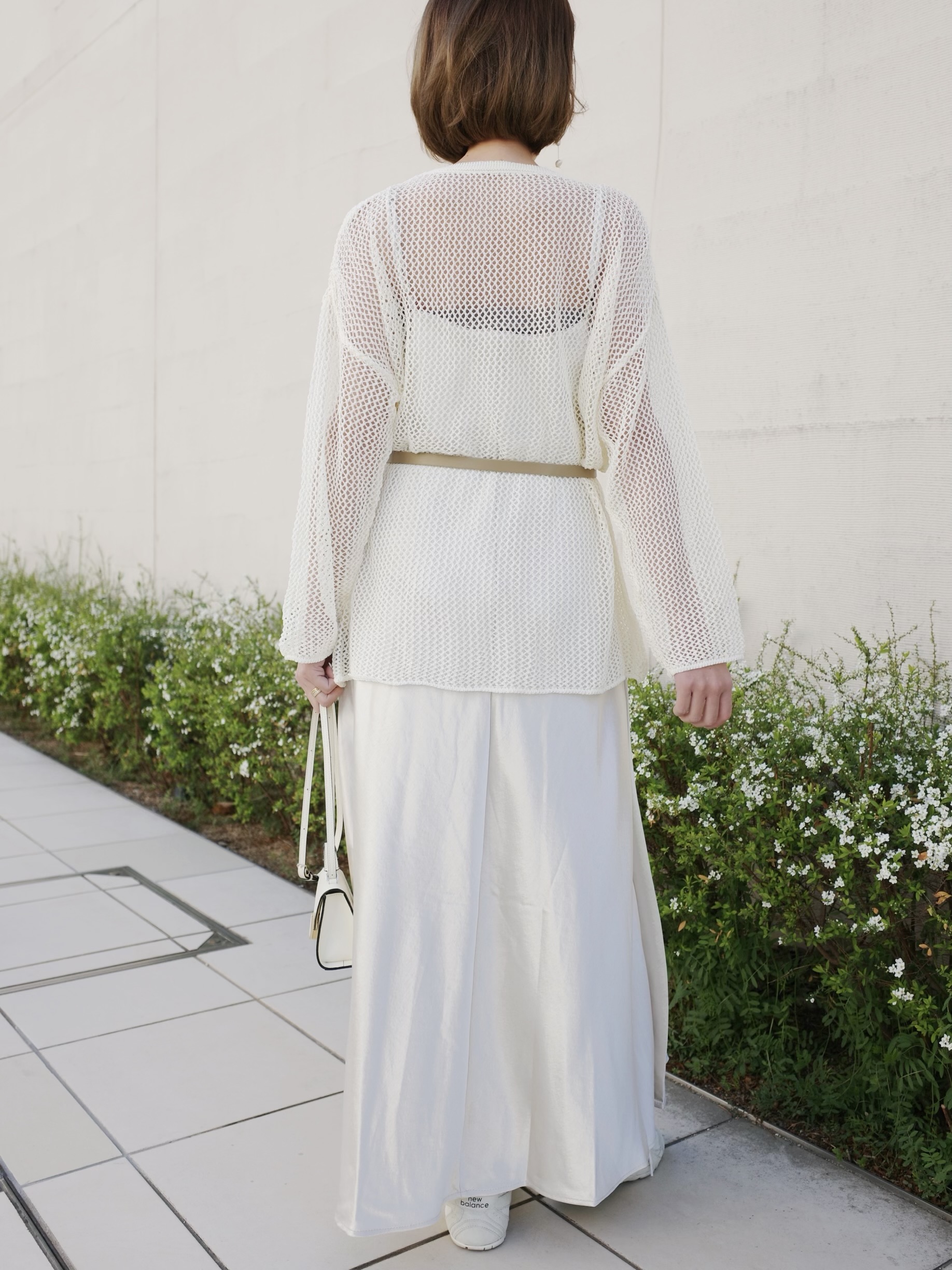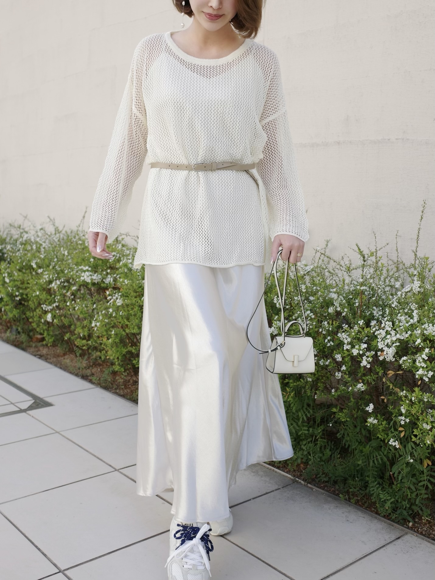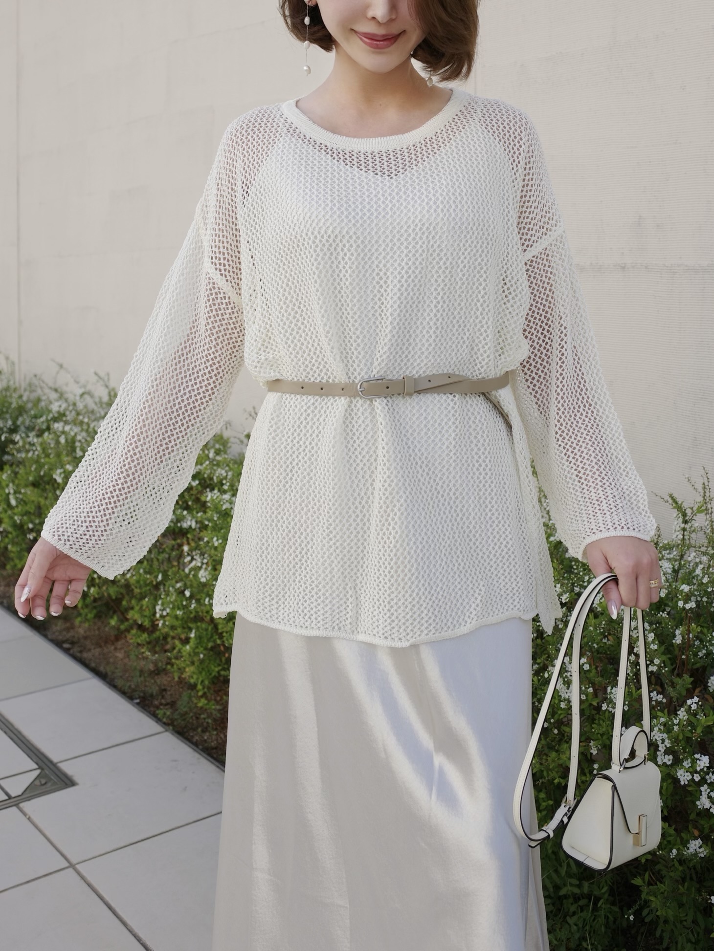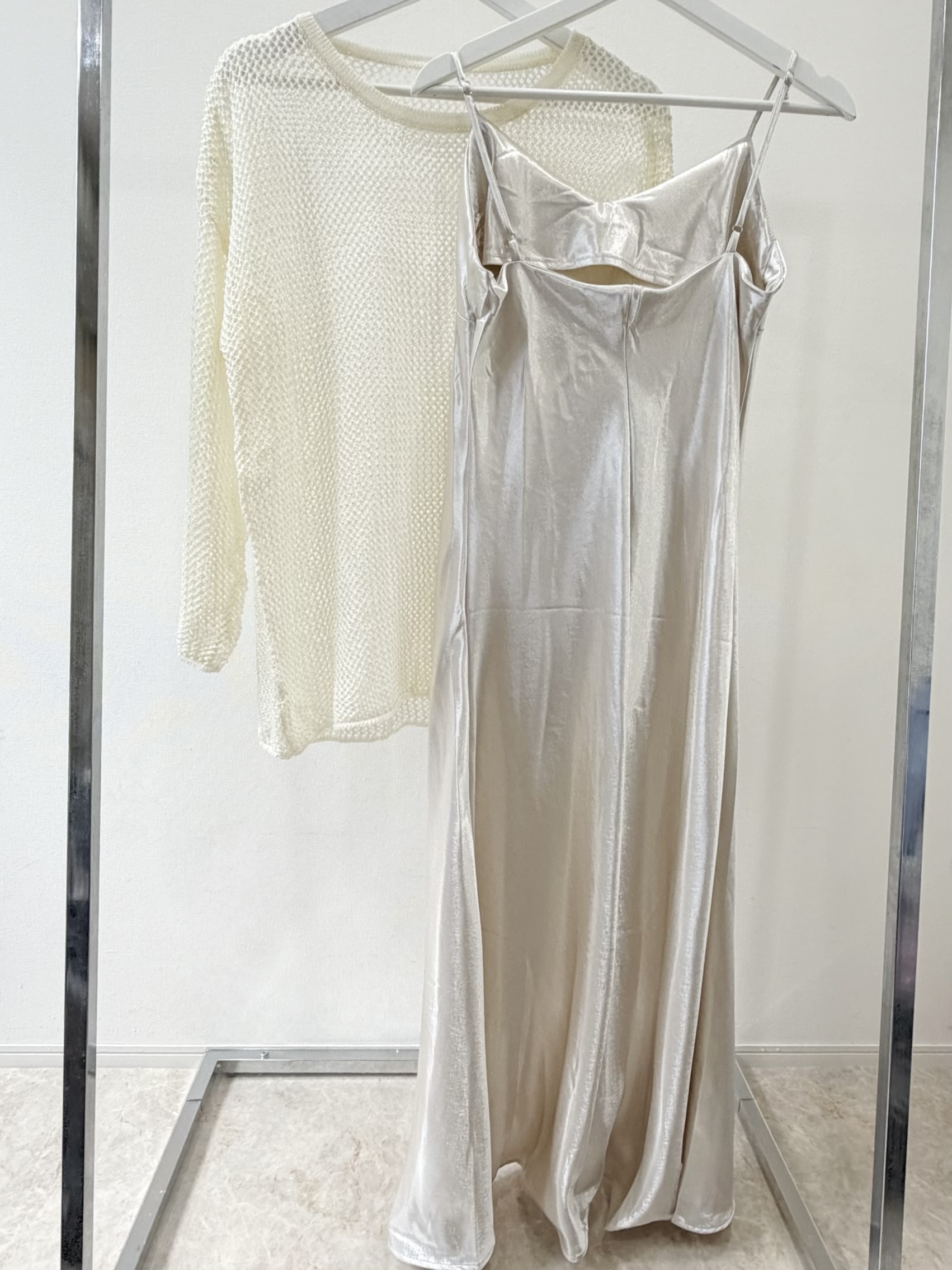 メッシュトップスがセットになったリラックス感漂うサテンワンピース。上品で柔らかな雰囲気のクリーム×シャンパンゴールドの色合わせが春夏にぴったり。動くたび揺れる光沢のあるドレープが春夏の太陽の下で映えます♡しっかりとしたサテン地で下着のラインも響きにくいのもポイント。付属のベルトでウエストマークすると更に女性らしく。身体のラインをカバーしてくれるゆるシルエットで細見えも叶えます。セットで着用するのはもちろん単体でも着用出来て着回し力も抜群。色んなスタイルを楽しめる欲張りさんにオススメの一着です。STAFF:158cm【サイズ】(平置き採寸)トップス/着丈54cm 身幅57cm 肩幅59cm 袖丈53cm ワンピース/着丈130cm(ストラップを最長にして計測/ここから短くできます) 身幅47cm【素材】ポリエステル65%,レーヨン35%■クロネコ代金後払いをご利用のお客様■商品到着後に請求書(払込用紙)が到着します。14日以内にお支払いをお願いします。全国の主要なコンビニで、請求書をレジに持っていくだけでお支払いが可能です。全国の郵便局でも同じ請求書でお支払いできます。※ご請求書が圧着ハガキタイプの場合、郵便局でのお支払いはできません。※弊社の銀行口座宛にお振込頂くものでは御座いません。ご注意下さい。