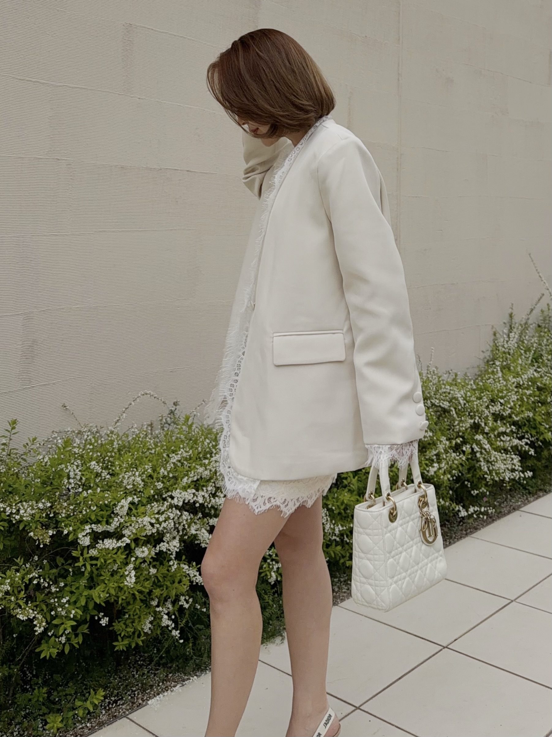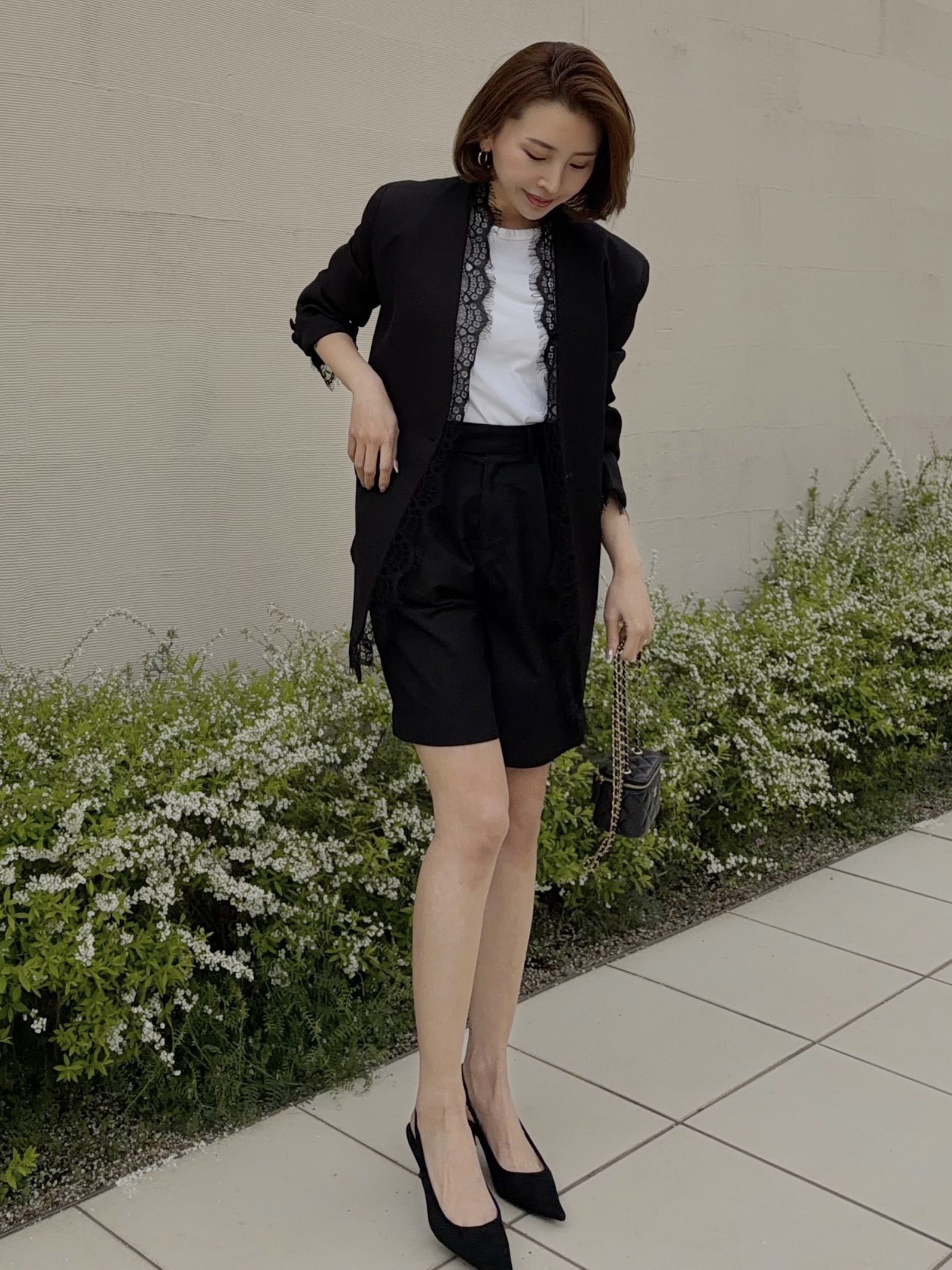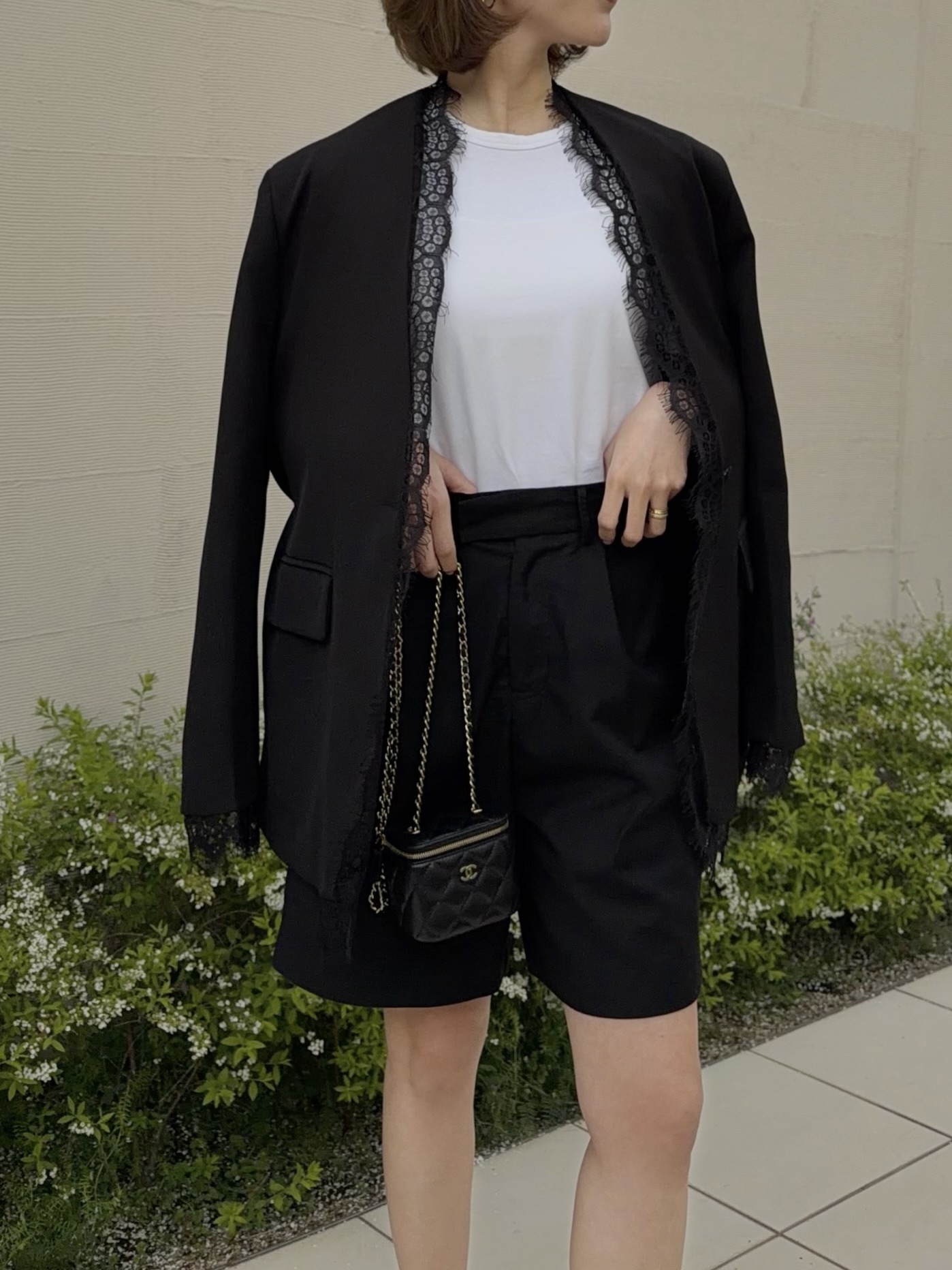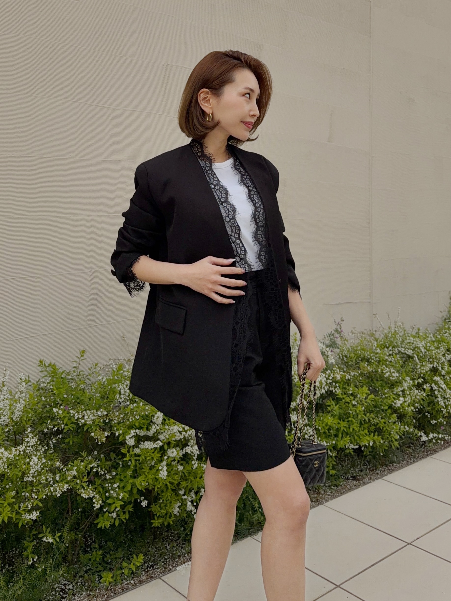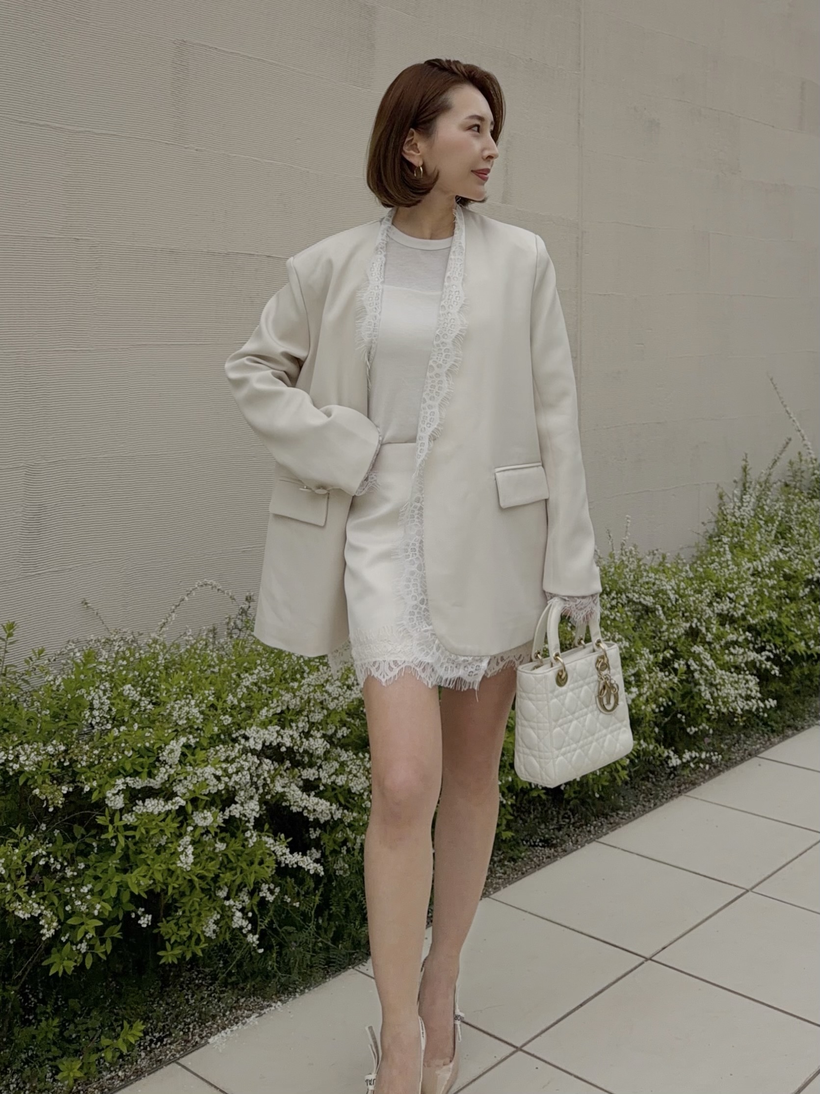 クールでマニッシュな印象のジャケットスタイルも女性らしい雰囲気に。