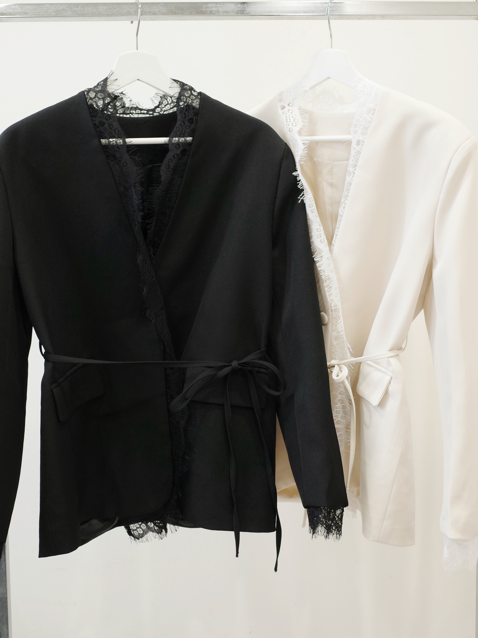 【ご好評につき再入荷♡】レース使いがフェミニンな雰囲気を演出するきれい目ジャケット。クールでマニッシュな印象のジャケットスタイルも女性らしい雰囲気に。ブラックとアイボリーの2カラー展開です。しっかりとした素材で高級感もたっぷり。取り外し可能なリボンを結んで着用しても、フロントを開けてラフに着ても素敵な一着です。シンプルなスタイリングに羽織るだけで着映えします。オケージョンシーンにもおすすめです。STAFF:158cm【サイズ】(平置き採寸)着丈72cm 肩幅46cm 身幅58cm 袖丈58cm(レース含む64cm)【素材】ポリエステル100%■クロネコ代金後払いをご利用のお客様■商品到着後に請求書(払込用紙)が到着します。14日以内にお支払いをお願いします。全国の主要なコンビニで、請求書をレジに持っていくだけでお支払いが可能です。全国の郵便局でも同じ請求書でお支払いできます。※ご請求書が圧着ハガキタイプの場合、郵便局でのお支払いはできません。※弊社の銀行口座宛にお振込頂くものでは御座いません。ご注意下さい。