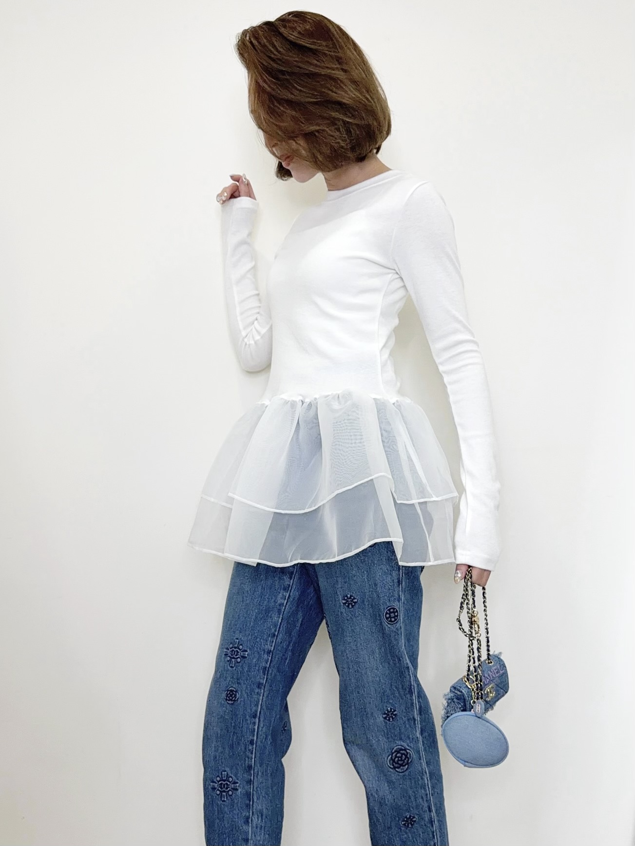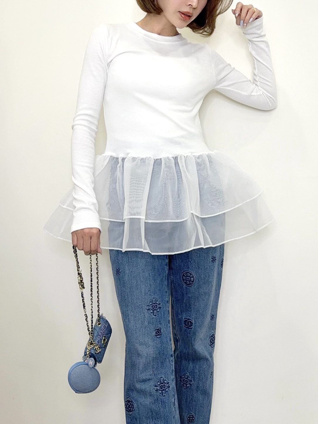 オーガンジーの立体的なフリルが目を引くトップス。
