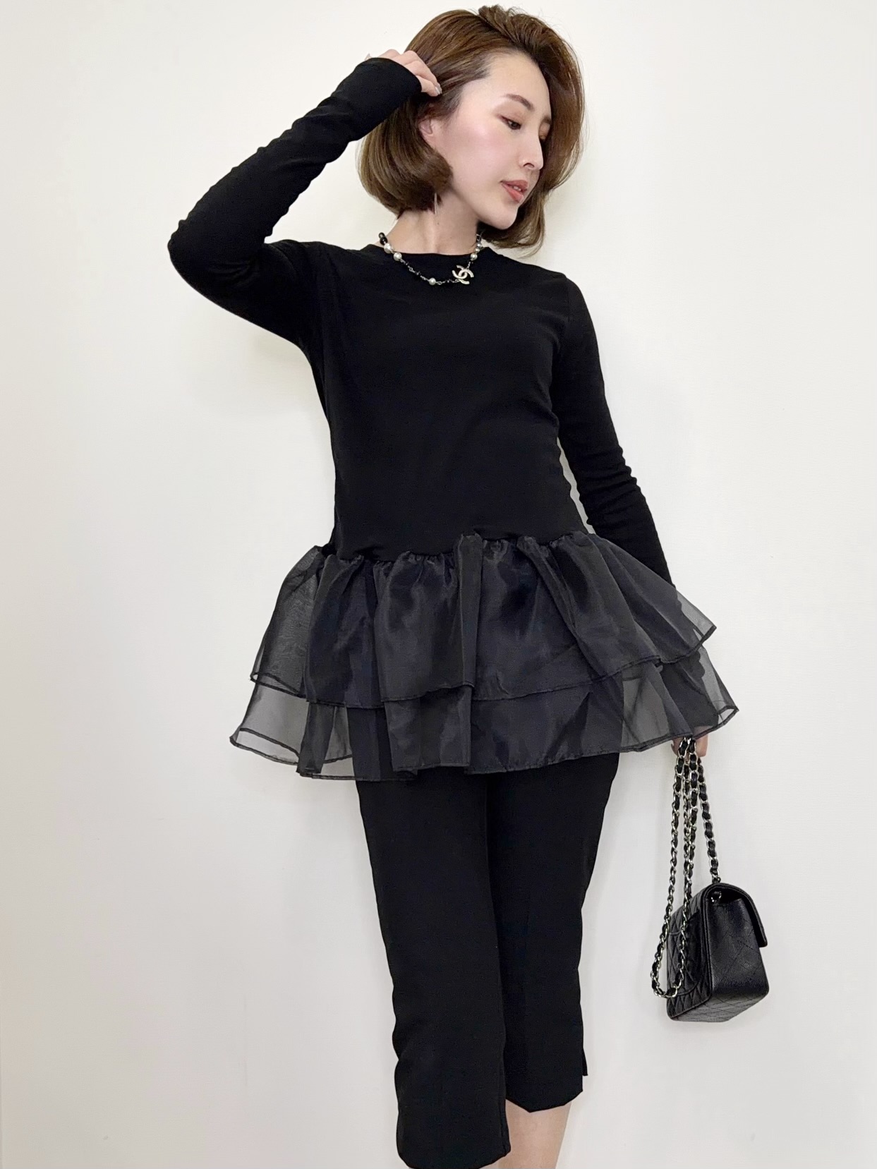 ※こちらの商品を単体で1点のみご注文頂いた場合、ネコポス配送(385円)にて発送が可能です。ご希望の方はご注文時にメッセージ欄にネコポス希望とご記入をお願いします。オーガンジーの立体的なフリルが目を引くトップス。ボディ部分は肌にしっとりと馴染む伸びの良い着心地のいい素材。ペプラムデザインが大人可愛い1枚です。シンプルなボトムスに合わせるだけで視線を奪う華やかなコーディネートが完成。ブラックとホワイトの2カラーです。ペプラムシルエットとヒップの隠れる着丈で体型もカバーしてくれます。STAFF:158cm【サイズ】(平置き採寸)着丈65cm 身幅51cm 袖丈68cm【素材】本体部分 ポリエステル60%,レーヨン35%,ポリウレタン5% フリル部分 ポリエステル100%■クロネコ代金後払いをご利用のお客様■商品到着後に請求書(払込用紙)が到着します。14日以内にお支払いをお願いします。全国の主要なコンビニで、請求書をレジに持っていくだけでお支払いが可能です。全国の郵便局でも同じ請求書でお支払いできます。※ご請求書が圧着ハガキタイプの場合、郵便局でのお支払いはできません。※弊社の銀行口座宛にお振込頂くものでは御座いません。ご注意下さい。
