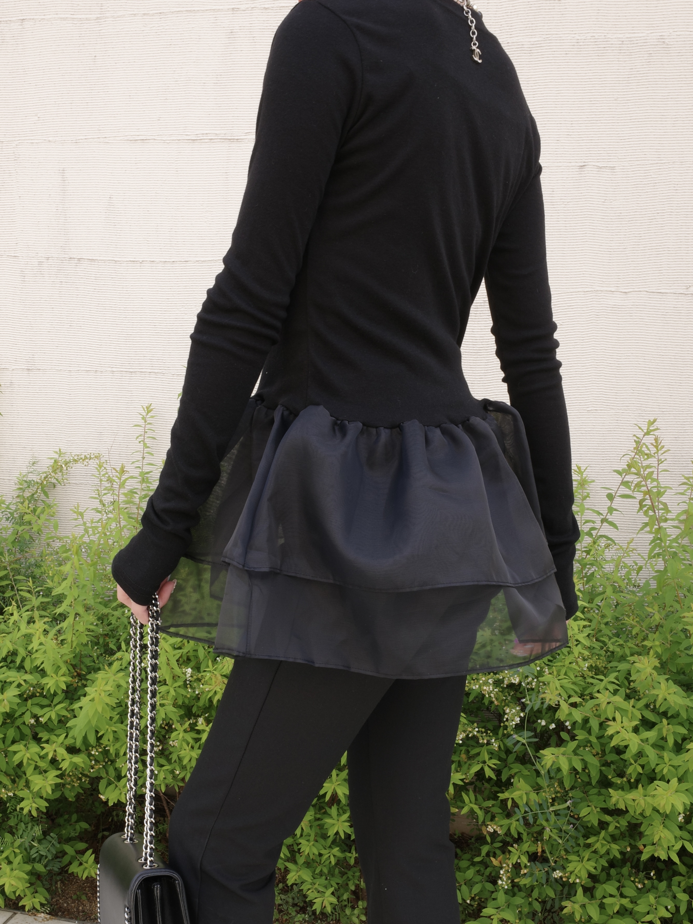 ※こちらの商品を単体で1点のみご注文頂いた場合、ネコポス配送(385円)にて発送が可能です。ご希望の方はご注文時にメッセージ欄にネコポス希望とご記入をお願いします。オーガンジーの立体的なフリルが目を引くトップス。ボディ部分は肌にしっとりと馴染む伸びの良い着心地のいい素材。ペプラムデザインが大人可愛い1枚です。シンプルなボトムスに合わせるだけで視線を奪う華やかなコーディネートが完成。ブラックとホワイトの2カラーです。ペプラムシルエットとヒップの隠れる着丈で体型もカバーしてくれます。STAFF:158cm【サイズ】(平置き採寸)着丈65cm 身幅51cm 袖丈68cm【素材】本体部分 ポリエステル60%,レーヨン35%,ポリウレタン5% フリル部分 ポリエステル100%■クロネコ代金後払いをご利用のお客様■商品到着後に請求書(払込用紙)が到着します。14日以内にお支払いをお願いします。全国の主要なコンビニで、請求書をレジに持っていくだけでお支払いが可能です。全国の郵便局でも同じ請求書でお支払いできます。※ご請求書が圧着ハガキタイプの場合、郵便局でのお支払いはできません。※弊社の銀行口座宛にお振込頂くものでは御座いません。ご注意下さい。