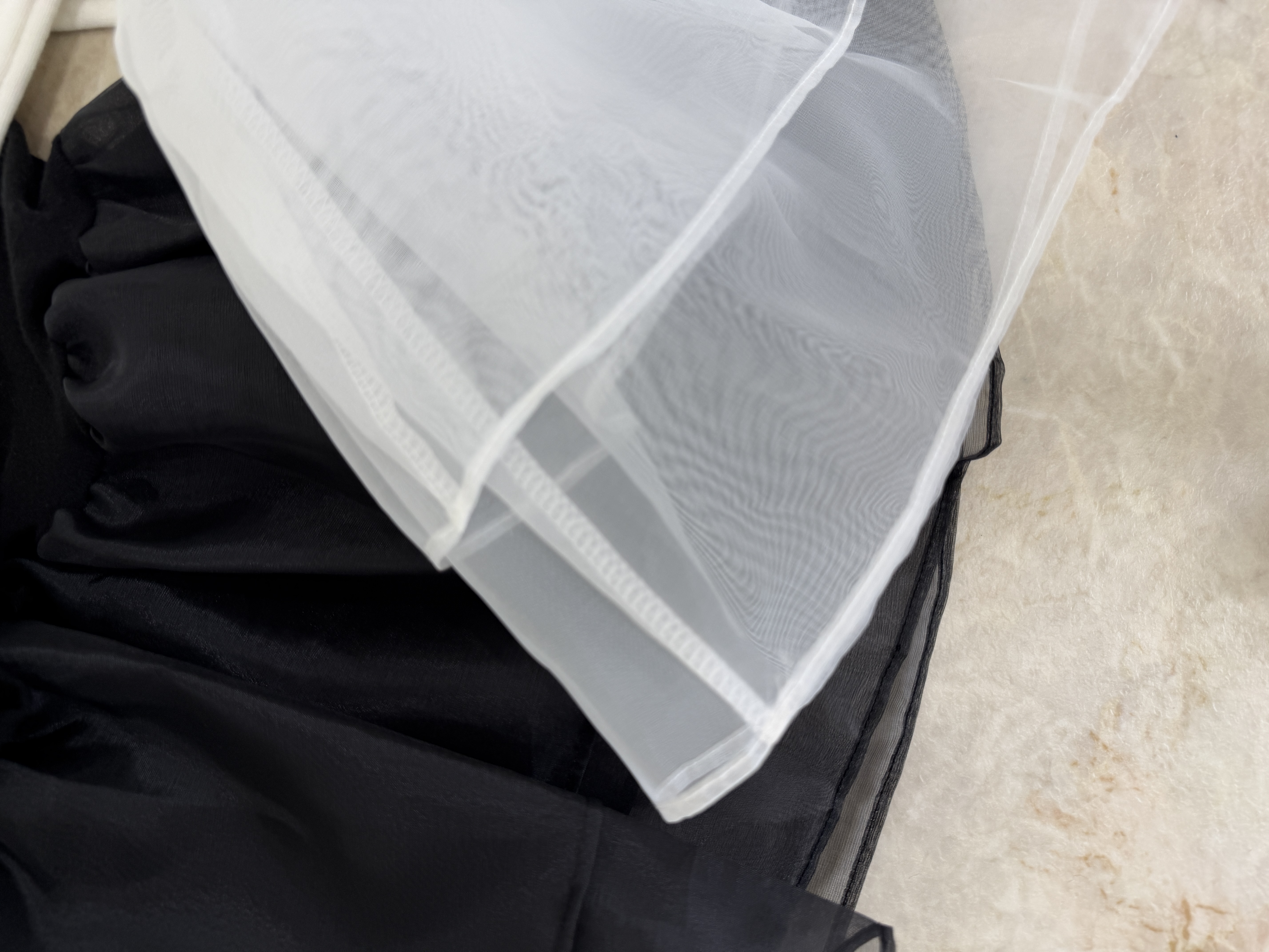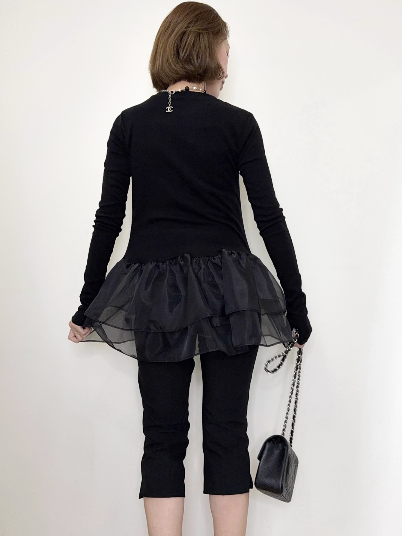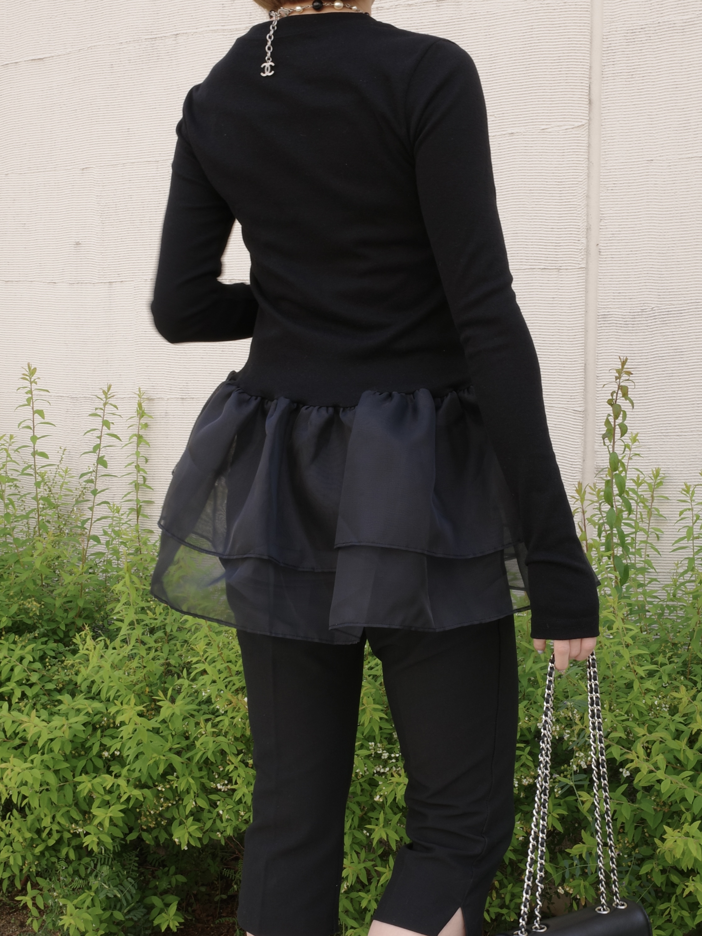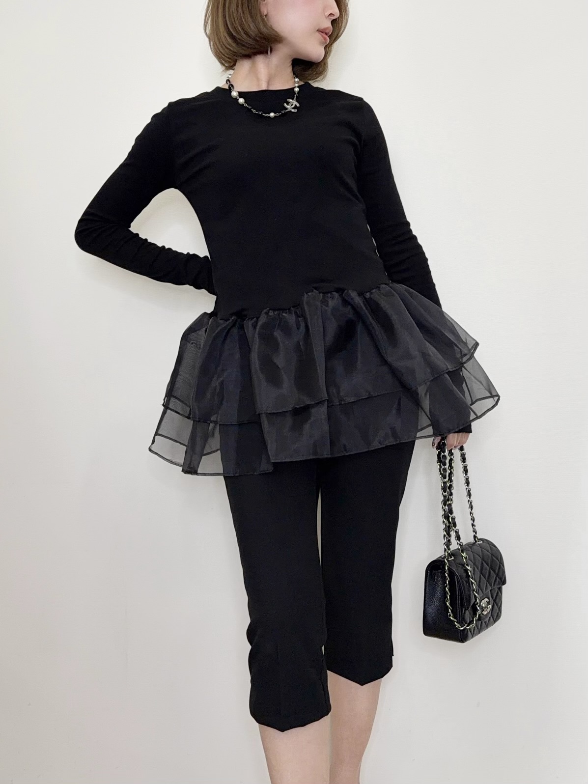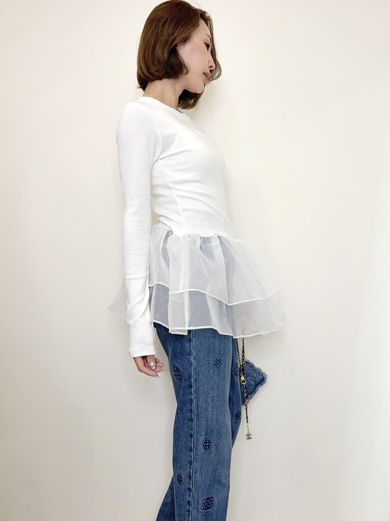 オーガンジーの立体的なフリルが目を引くトップス。